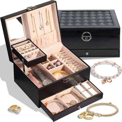 ⭐ Szkatułka na biżuterię posiada dwa poziomy z szufladkami, co pozwala na odpowiednie uporządkowanie biżuterii i innych drobiazgów w elegancki sposób.