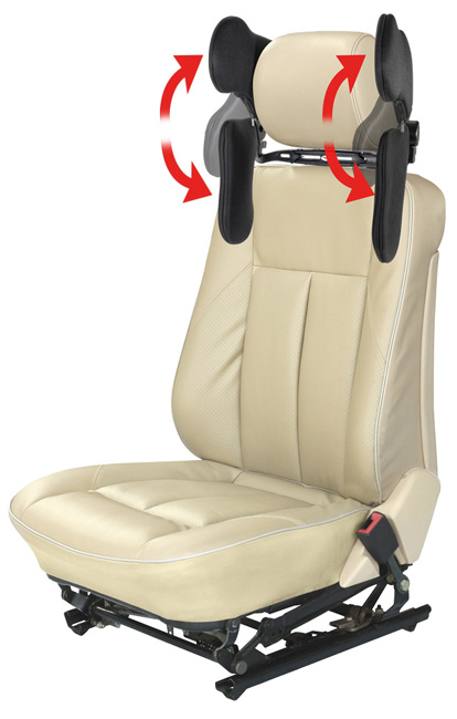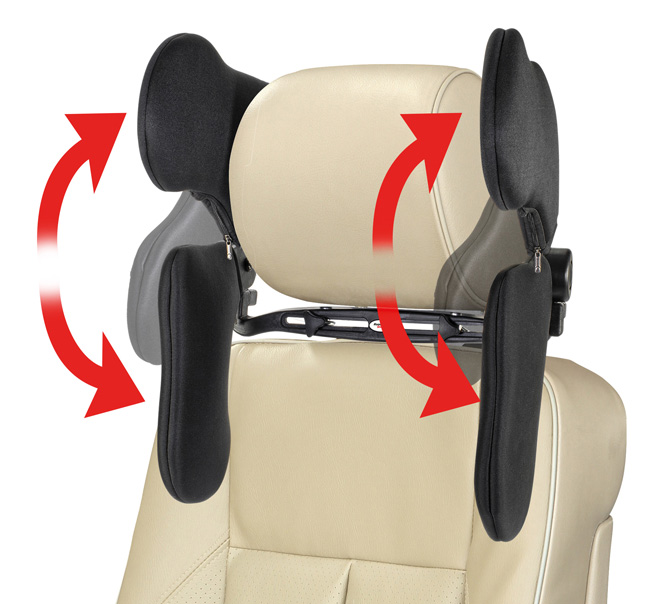 Boczne poduszki są wygodnie montowane na fabrycznych zagłówkach samochodu. Można regulować ich wysokość, by dopasować je do wzrostu zarówno dzieci, jak i dorosłych. Kiedy nie są potrzebne, wystarczy unieść je do góry. Regulowany zagłówek można zamontować na przednich i tylnych siedzeniach pasażerów.