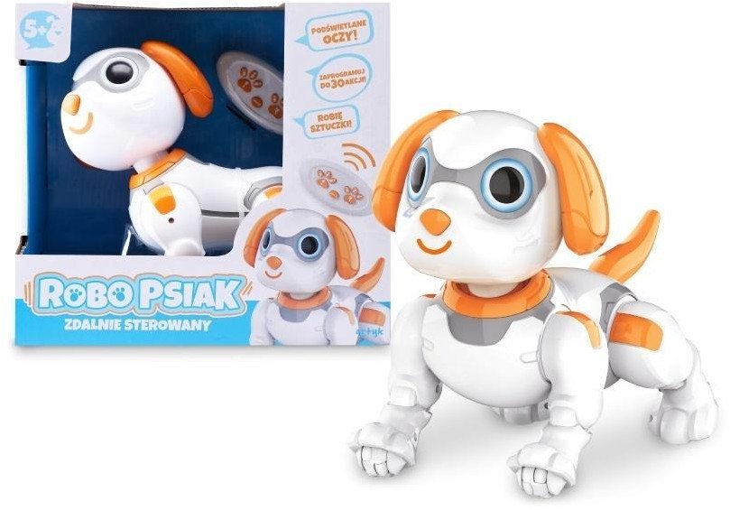 W zestawie: robot-pies 19 cm, pilot, instrukcja, funkcje: podświetlane oczy, ruchomy ogon, sterowanie: kroki do przodu, ślizg do przodu, bieg do przodu, ślizg do tyłu, skręt w lewo, skręt w prawo, siad, stójka/warowanie, taniec do muzyki, tryb programowania, wym. opak. 26 x 14 x 24 cm, baterie 4 x aaa 1.5v (pies) , 2 x aaa (pilot) niedołączone, 5+