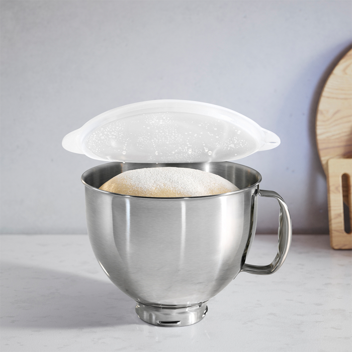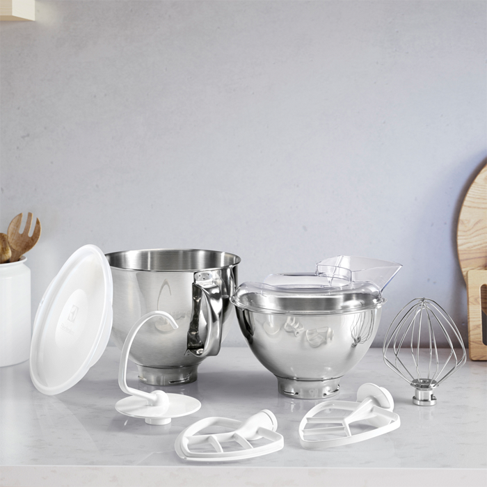 W komplecie końcówka do mieszania SoftEdgeBeater™, pokrywa PerfectRiseLid™, końcówka do ubijania, końcówka do mieszania, mieszadło hakowe, pokrywa ochronna oraz dwie misy.