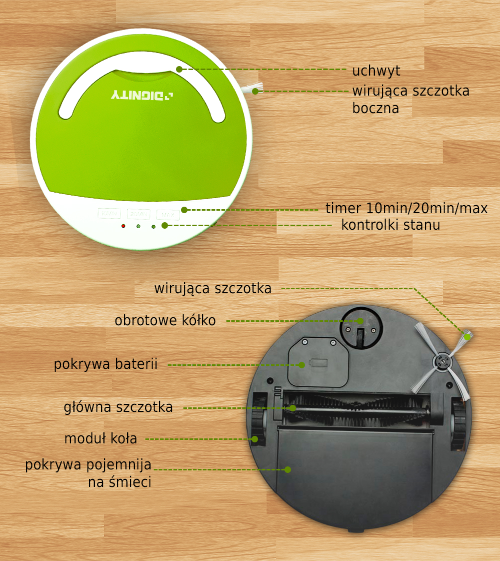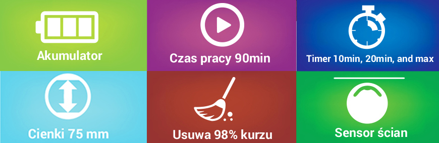 timer 10 min, 20 min, max powierzchnia czyszcząca 240 mm szerokości czas pracy 90 min system sensorów wykrywania przeszkód usuwa 98% brudu |