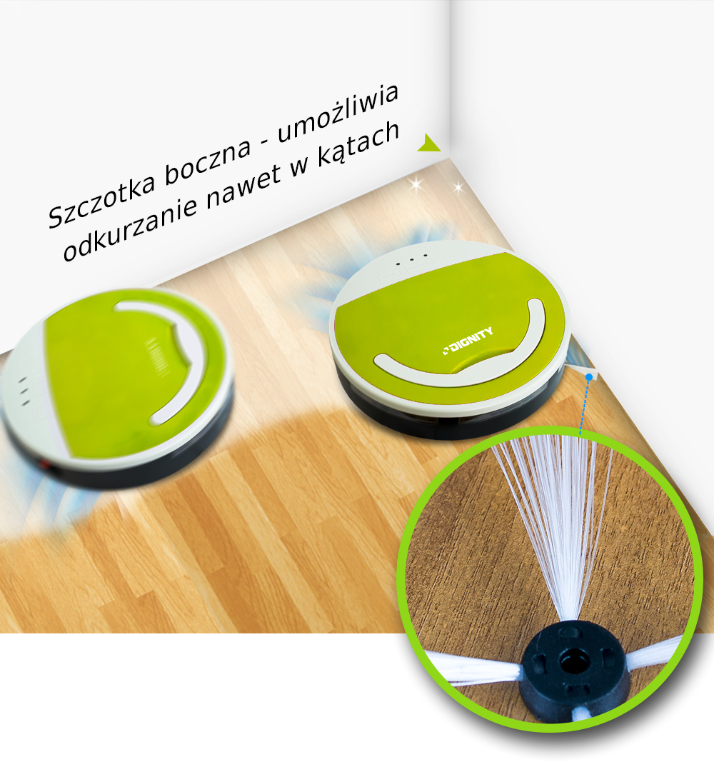 Z robotem sprzątającym Dignity utrzymasz czyste podłogi i wykładziny zupełnie bez wysiłku. Dignity jest odkurzaczem ssącym – zamiast szczotki posiada silnik, który działa jak turbina i zasysa wszelkie zanieczyszczenia. Nie ważne, czy masz w domu kafelki, linoleum czy wykładzinę – dzięki robotowi Dignity odkurzanie zostanie już tylko niemiłym wspomnieniem. |