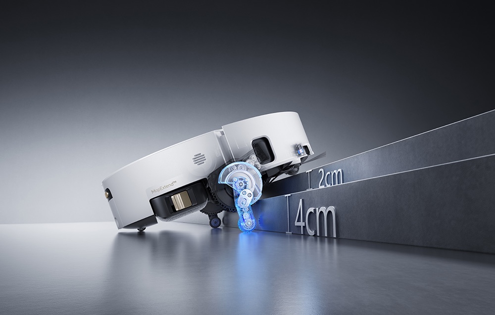 Rewolucyjny system ProLeap™ sprawia, że Dreame Aqua10 Ultra Track Complete bez trudu radzi sobie z progami i stopniami, które dla innych robotów są barierą. Urządzenie potrafi wjechać na progi o wysokości do 4,2 cm, a w przypadku ułożonych podwójnie elementów – pokonać przeszkody nawet do 6 cm. Dzięki wysuwanym „nogom” i elastycznym ramionom nie zatrzymuje się na listwach, grubych dywanach czy prowadnicach drzwi. Dodatkowo podwozie Triple-Wheel AgiLift™ z trzema regulowanymi kołami, silikonowymi podkładkami i amortyzatorami zapewnia stabilność, tłumi hałas i zapobiega przenoszeniu wilgoci na wykładziny. W efekcie sprzątanie odbywa się płynnie i dokładnie w całym domu.