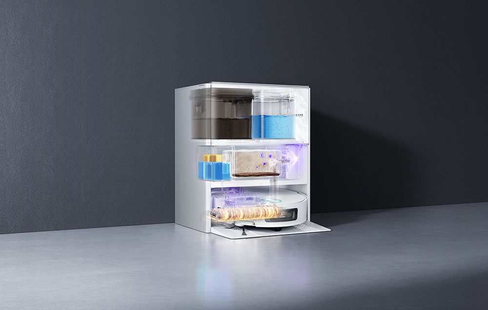 Stacja dokująca oferuje rozwiązanie Dual-Solution Compartment – dwa osobne pojemniki na płyny. Jeden przeznaczony jest do codziennego czyszczenia podłóg, a drugi do neutralizacji zapachów po zwierzętach. Dzięki temu robot automatycznie dobiera najlepsze rozwiązanie do danej sytuacji i zapewnia idealny efekt.