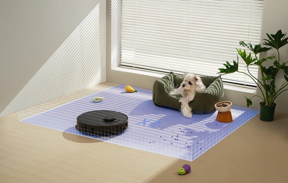 Robot rozpoznaje strefy związane z obecnością pupili i dostosowuje sposób sprzątania, np. powtarzając przejazd w wybranych miejscach. Dzięki temu skutecznie zbiera sierść i resztki karmy, a regulacja ilości wody podczas mopowania ułatwia szybkie schnięcie podłóg. Całość wspierają cicha praca i blokada rodzicielska, zabezpieczająca ustawienia przed przypadkowymi zmianami przez dzieci lub zwierzęta.