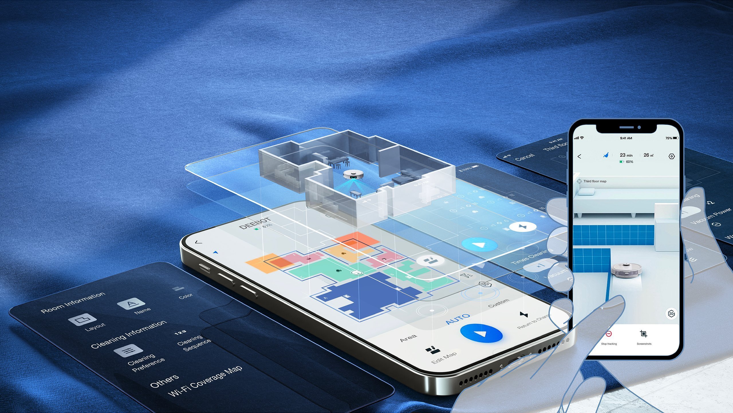 Kontrola i dostosowanie sprzątania z dowolnego miejsca za pomocą nowo zaprojektowanej aplikacji Ecovacs* Home. Inteligentniejsza i bardziej spersonalizowana obsługa dzięki trójwymiarowej mapie, która odzwierciedla rzeczywisty widok domu. Płynne przełączanie widokami między dwu- i trójwymiarowymi mapami domu pozwala określić najlepszą możliwą trasę sprzątania.