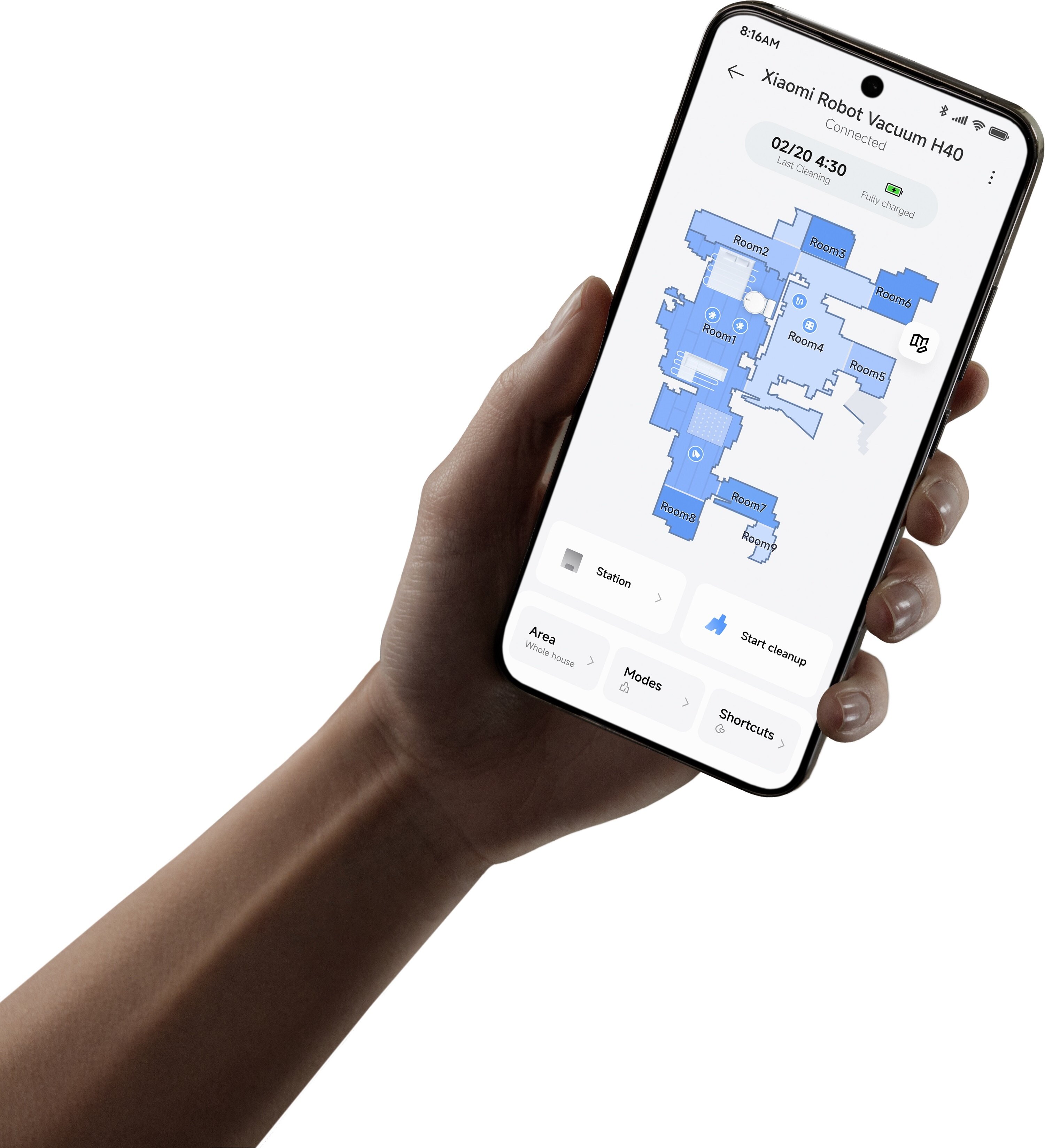 Wydajny akumulator o pojemności 5200 mAh pozwala Xiaomi Robot Vacuum H40 na długi czas pracy wynoszący do 180 minut w trybie standardowym. Taka pojemność umożliwia jednoczesne odkurzanie i mopowanie dużych powierzchni mieszkalnych, nawet do 160 m² na jednym pełnym ładowaniu. Gdy poziom naładowania jest niski, robot automatycznie wraca do stacji dokującej, aby się naładować, a następnie kontynuuje sprzątanie od miejsca, w którym przerwał.