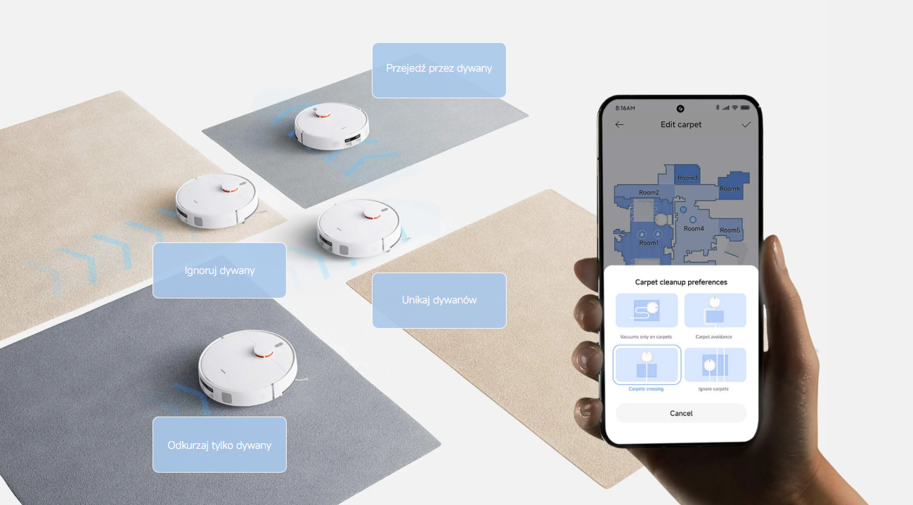 - Funkcje w aplikacji: Mapowanie 3D, mapy wielopoziomowe, wirtualne ściany, strefy zakazane, planowanie sprzątania