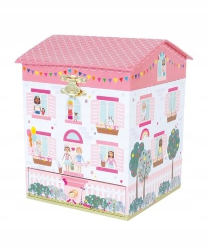Muzyczna szkatułka na biżuterię w formie domku dla lalek to doskonałe rozwiązanie do przechowywania dziecięcej biżuterii, gumek do włosów, spinek oraz innych cennych drobiazgów. Ozdobiona urokliwymi ilustracjami, szkatułka zachwyca zarówno swoim wyglądem, jak i funkcjonalnością, stając się nie tylko praktycznym akcesorium, ale również piękną dekoracją w pokoju dziecięcym.