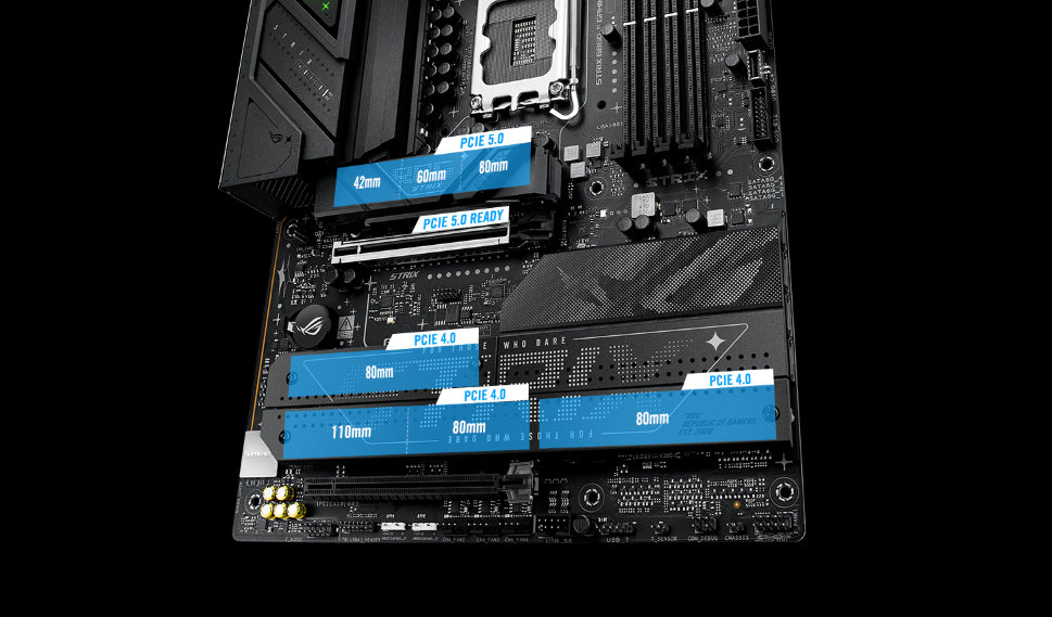 Strix B860-F oferuje kompleksowe wsparcie PCIe 5.0, a najwyższe gniazdo rozszerzeń x16 jest chronione przez wspornik SafeSlot, aby wytrzymać ciężar najnowszych kart graficznych. Jedno zintegrowane gniazdo M.2 jest oceniane na błyskawiczne prędkości odczytu i zapisu do 16 GB/s, podczas gdy pozostałe mogą zapewnić nadal imponujące transfery 8 GB/s. A każde gniazdo M.2 jest pokryte solidnymi radiatorami, aby odprowadzać ciepło dysków nowej generacji.