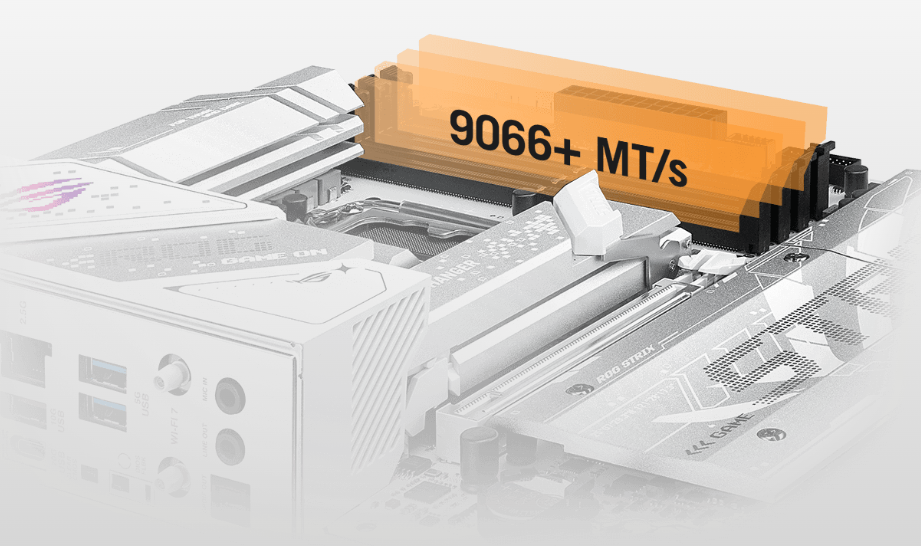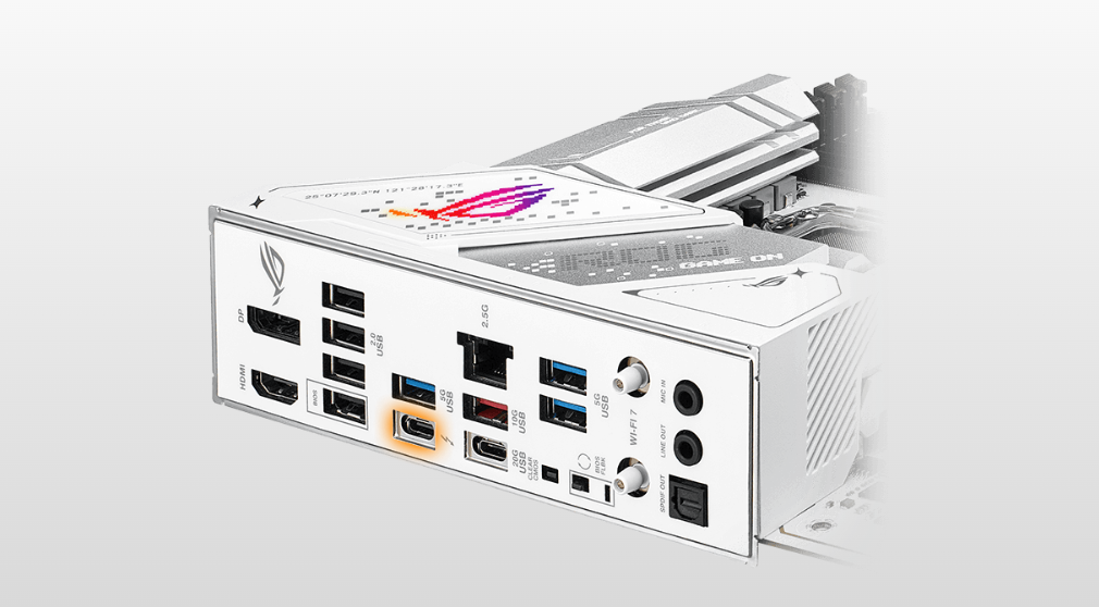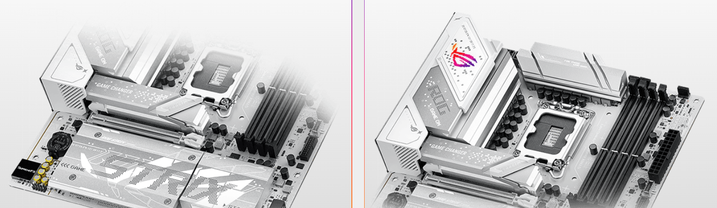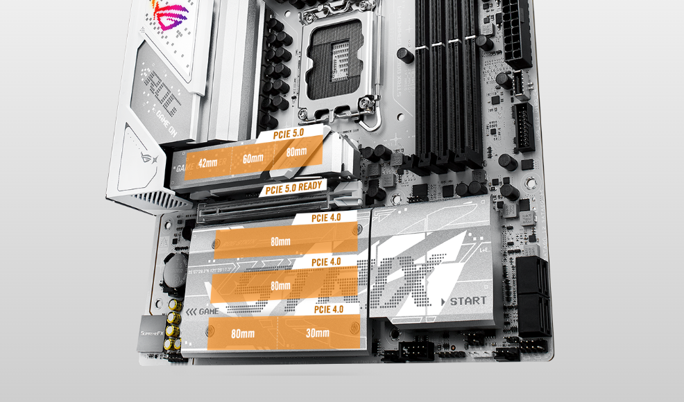 Strix B860-G oferuje kompleksowe wsparcie PCIe 5.0, a najwyższe gniazdo rozszerzeń x16 jest chronione przez wspornik SafeSlot, aby wytrzymać ciężar najnowszych kart graficznych. Jedno zintegrowane gniazdo M.2 jest oceniane na błyskawiczne prędkości odczytu i zapisu do 16 GB/s, podczas gdy pozostałe mogą zapewnić nadal imponujące transfery 8 GB/s. A każde gniazdo M.2 jest pokryte solidnymi radiatorami, aby odprowadzać ciepło dysków nowej generacji.