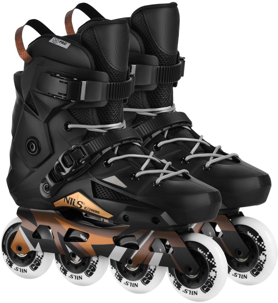 Łyżworolki slalomowe NA1601 NILS EXTREME w eleganckim czarnym kolorze to znakomity wybór dla średniozaawansowanych oraz zaawansowanych użytkowników, którzy chcą doskonalić swoje umiejętności w technice jazdy oraz dynamicznych manewrach. Dzięki precyzyjnemu prowadzeniu i błyskawicznej reakcji na ruch stopy, te rolki sprawdzą się zarówno w slalomie, jak i w sportowej jeździe miejskiej.