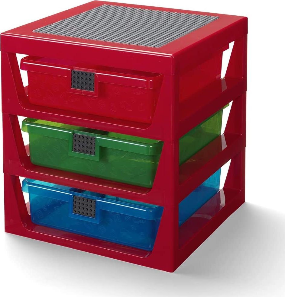 Pudełko z szufladami LEGO ma trzy półprzezroczyste szuflady z elementami LEGO po bokach. Służy do porządkowania i sortowania klocków lub zabawek LEGO. Każda wyjmowana szuflada ma z przodu tabliczkę LEGO (4 × 6) do indywidualnego projektowania. Podstawka LEGO (32 × 32) na górze sprawia, że stojak do przechowywania idealnie nadaje się jako stanowisko konstrukcyjne lub do prezentacji najnowszych dzieł LEGO.