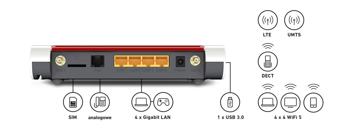 FRITZ!Box 6850 LTE zapewnia szybkie pobieranie danych przez LTE (4G), a Ty możesz cieszyć się pełną wygodą FRITZ!Box: Zintegrowana stacja bazowa DECT sprawia, że rozmowy telefoniczne z maksymalnie sześcioma telefonami bezprzewodowymi są przyjemne. Niezawodne Wi-Fi łączy domowe urządzenia sieciowe z szybkim mobilnym Internetem.