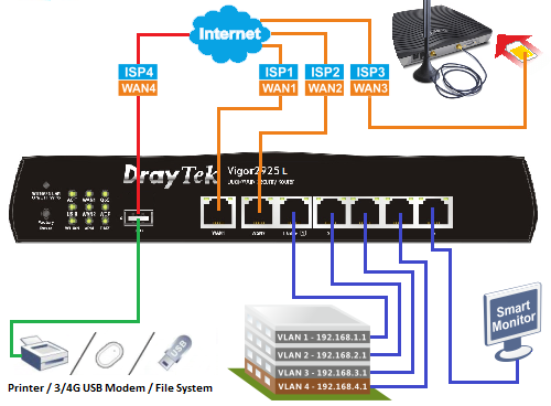 Interfejs LAN stanowi wbudowany 5-portowy Gigabitowy switch z funkcją VLANtagging / IEEE 802.1Q, umożliwiającą pełną, profesjonalną segmentację ruchu w sieci. Router potrafi odizolować i podłączyć do Internetu do 5 prywatnych podsieci IP z translacją NAT. Lokalny serwer DHCP pozwala na przydział konkretnym użytkownikom właściwych adresów IP co w powiązaniu ze ścisłą kontrolą uniemożliwia dostęp do sieci osobom niepożądanym. Istnieje również możliwość kontrolowania dostępu do Internetu z wykorzystaniem zarządzania użytkownikami.