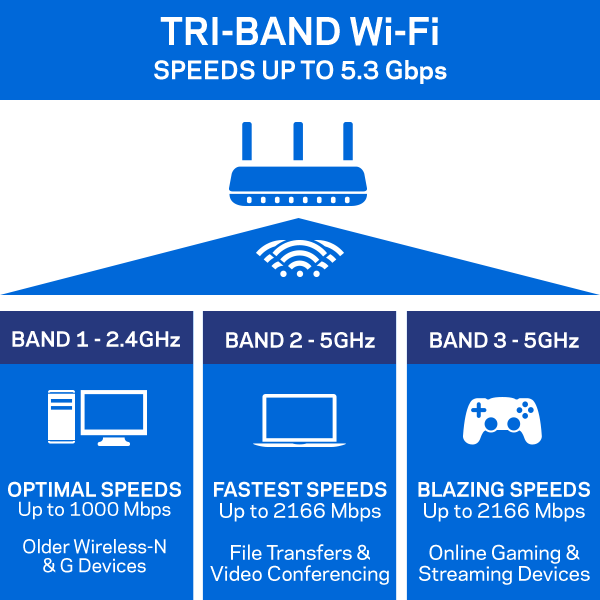 Technologia Tri-Band podwaja wydajność Wireless-AC. Aplikacje wysokiej przepustowości, takie jak wideokonferencje i przesyłanie strumieniowe filmów są idealne dla dwóch szybkiego 5 GHz, podczas gdy urządzenia niższej przepustowości, takie jak Wireless N w starszych komputerach i G mogą wykorzystywać pasmo 2,4 GHz.