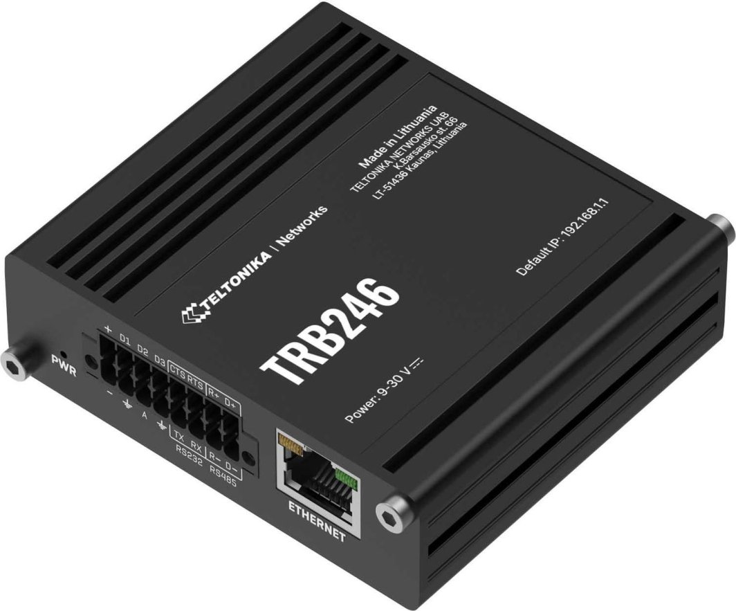 Teltonika Przemysłowy router, brama IoT LTE TRB246 Cat 4, 1x RJ45 100Mb/s, IP30. Typ napędu: Brama sieci komórkowej, Kolor produktu: Czarny, Materiał obudowy: Aluminium. Typ interfejsu Ethernet LAN: Fast Ethernet, Prędkość transferu danych przez Ethernet LAN: 10,100 Mbit/s, Standardy komunikacyjne: IEEE 802.11e, IEEE 802.3, IEEE 802.3az, IEEE 802.3u. Sieć danych: 2G, 3G, 4G, LTE, Interfejs SIM: 3 V, Typ karty SIM: MiniSIM. Interfejs SCSI: RS-232, RS-232/485, Sygnały złącza RS-232: CTS, RTS, Rx, Tx, Sygnały złącza RS-485: Data+, Data-, RDA-, RDB+. Producent procesora: Mediatek, Taktowanie procesora: 0,58 GHz, Pojemność pamięci RAM: 0,128 GB