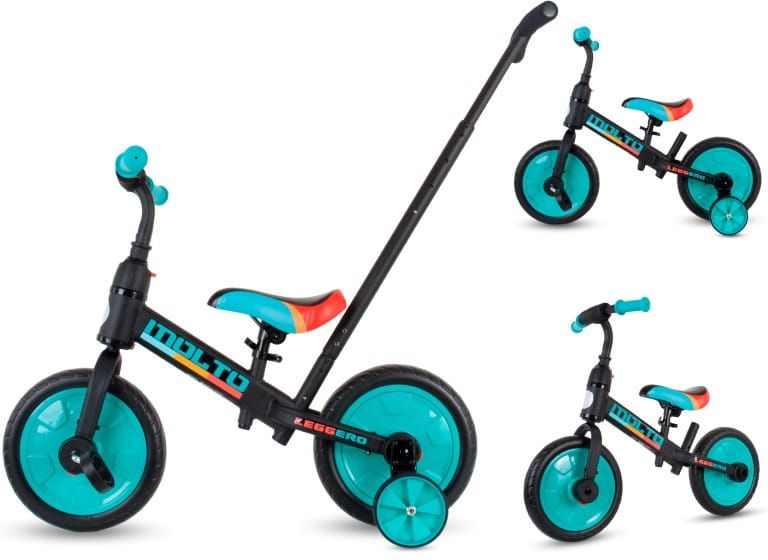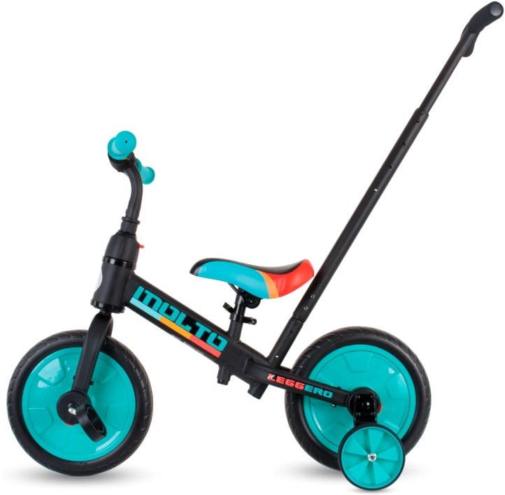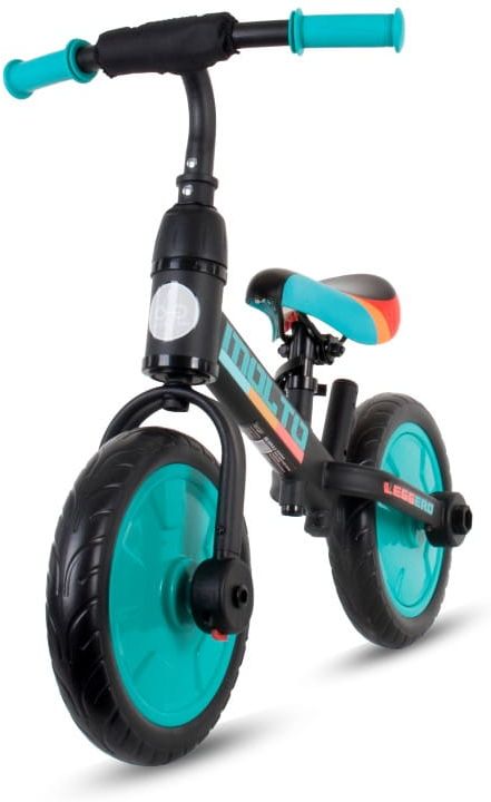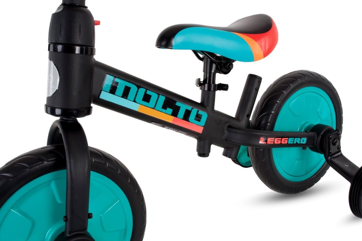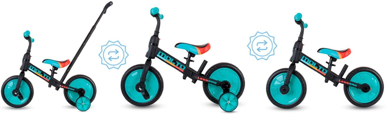 Dołączane kółka pomocnicze pozwalają dziecku oswoić się z rowerkiem i zapewnią łatwy start. Zamontowanie pedałów sprawia, że MOLTO działa jak hybryda rowerka trójkołowego z rowerkiem biegowym. Po odłączeniu kółek bocznych, MOLTO staje się tradycyjnym rowerkiem biegowym.