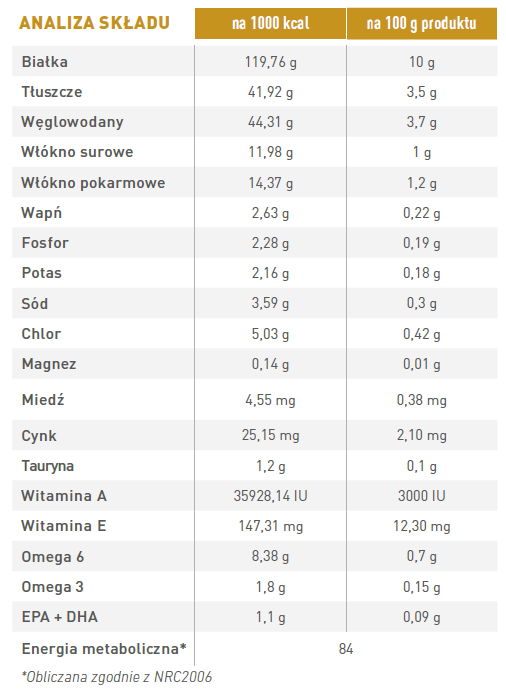 Dodatki dietetyczne: Witamina D3: 225 UI, E1 (Zelazo): 3 mg, E2 (Jod): 0,25 mg, E4 (Miedz): 2 mg, E5 (Mangan): 1 mg, E6 (Cynk): 10 mg- Siarka: 0,17% - Substancje zakwaszajace mocz: Siarczan wapnia: 0,25%.