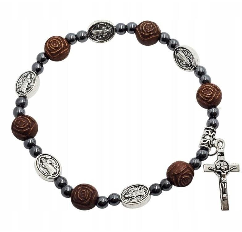 Brązowe koraliki w kształcie róży nadają różańcowi unikalny charakter. Ich elegancki wygląd, w połączeniu z małymi kuleczkami hematytu, tworzy harmonijną całość, która przyciąga wzrok. Różaniec jest elastyczny i wygodny w noszeniu, co sprawia, że jest idealnym wyborem dla osób pragnących mieć przy sobie symbol wiary w każdej chwili.