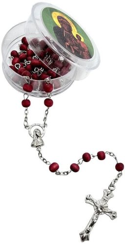 Różaniec zapachowy w eleganckim pudełku z wizerunkiem Matki Boskiej Częstochowskiej to wyjątkowy produkt, który harmonijnie łączy tradycję modlitwy z przyjemnością płynącą z aromatu. Wykonany z drewnianych koralików w głębokim bordowym odcieniu, ten różaniec nie tylko spełnia swoje duchowe zadanie, ale również wprowadza do otoczenia niepowtarzalny klimat. Jego długość wynosząca 45 cm sprawia, że jest niezwykle wygodny w użyciu, co czyni go idealnym towarzyszem codziennych modlitw.
