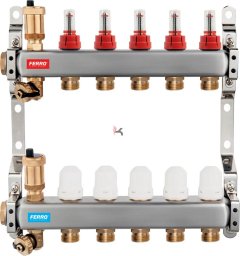 Rozdzielacz ze stali nierdzewnej 1 7-drogowy z zaworami termostatycznymi, przepływomierzami, odpowietrznikami automatycznymi, zaworami spustowymi, nyplami 3/4
