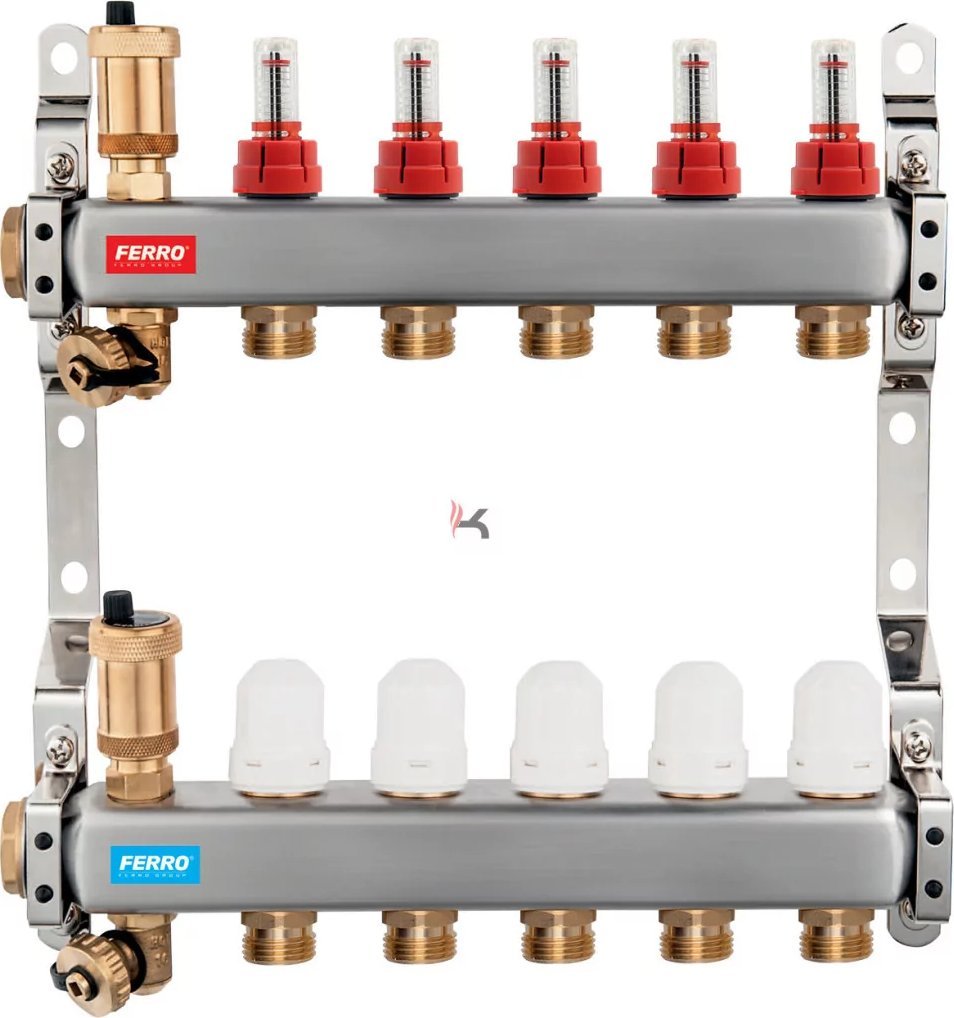 Rozdzielacz ze stali nierdzewnej 1 7-drogowy z zaworami termostatycznymi, przepływomierzami, odpowietrznikami automatycznymi, zaworami spustowymi, nyplami 3/4