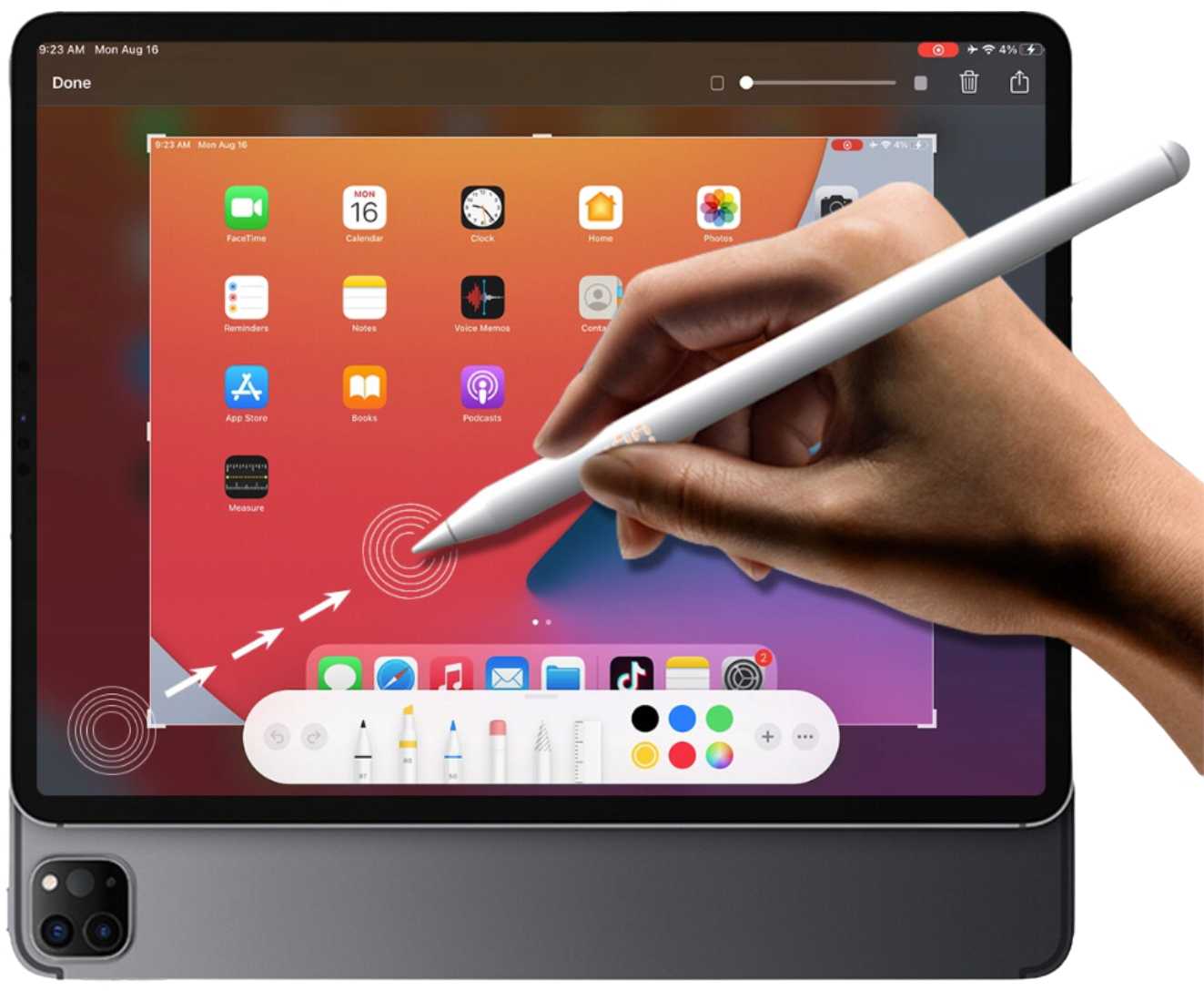 Dzięki intuicyjnym gestom, korzystanie z iPada staje się jeszcze bardziej płynne i wygodne. Na przykład, jednym szybkim ruchem możesz przeciągnąć rysik z dolnego rogu ekranu, aby natychmiast wykonać zrzut ekranu, a następnie od razu otworzyć go w edytorze. Możesz również ustawić, który dolny róg ekranu odpowiada za wykonanie tego gestu. Co więcej, rysik umożliwia szybkieotwarcie ostatniej notatki lub stworzenie nowej – wystarczy gest przeciągnięcia, aby natychmiast przejść do aplikacji Notatki.