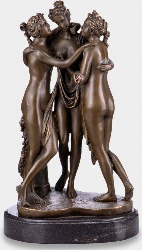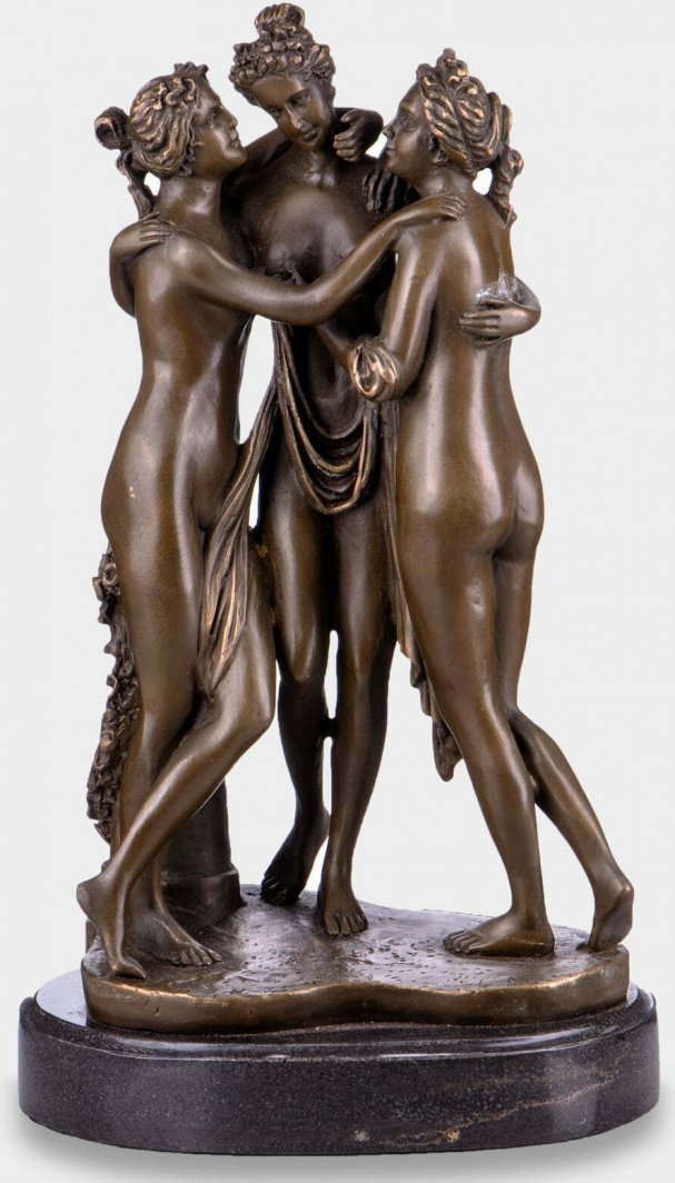Rzeźba z brązu przedstawiająca trzy nagie kobiety tzw. Trzy Gracje, inspirowana dziełem Antonio Canova o tym samym tytule. Piękna, sygnowana rzeźba, wykonana z ekskluzywnego materiału, bardzo precyzyjnie, z dbałością o najdrobniejsze detale. Osadzona na podstawie z czarnego marmuru. Figura robi ogromne wrażenie estetyczne i ma ponadczasowy styl. Pasuje do wielu wnętrz.