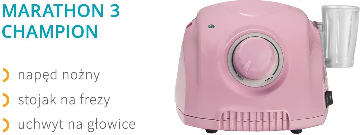 Frezarka Marathon 3 Champion w kolorze różowym doskonale wpasuje się jako element każdego gabinetu kosmetycznego, niezależnie od wystroju. Urządzenie zapewnia cichą pracę. Drgania głowicy zostały całkowicie wyeliminowane, co pozwala na spokojne wykonywanie zabiegu.