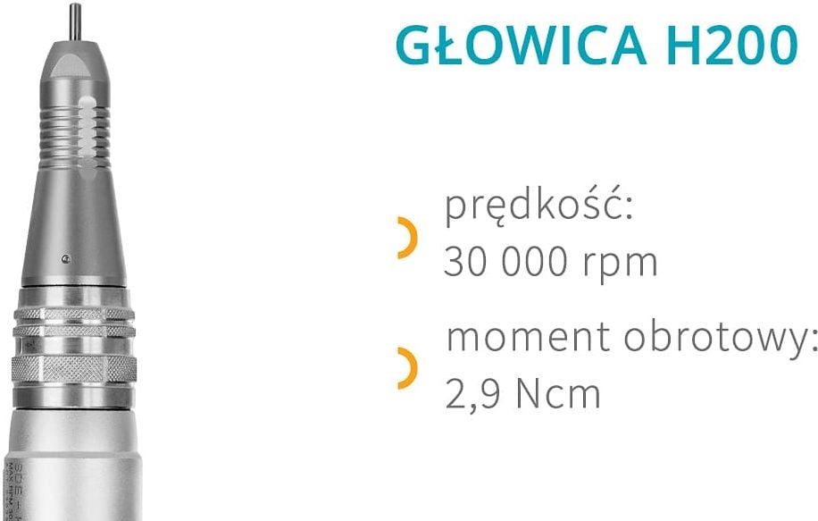 Frezarkę tę możemy obsługiwać zarówno ręcznie, jak i nogą dzięki dołączonemu napędowi nożnemu. Moment obrotowy 2,9Ncm pozwala na płynną regulację ruchów w zakresie od 0 do 30 tysięcy obrotów. Do zestawu dołączony został uchwyt na głowicę, dzięki któremu możemy w każdej chwili odłożyć ją podczas zabiegu w bezpieczne i stabilne miejsce.