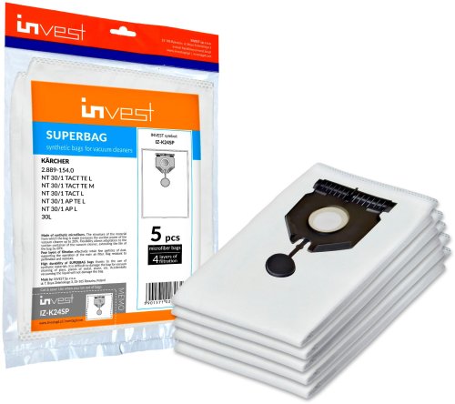 Parametry worka: Ilość: 5 szt. Jednostka: 1 komplet Rodzaj worków: syntetyczny Materiał: microwłóknina syntetyczna Uchwyt worka: plastikowy Ilość warstw filtracji: 4 Rodzaj: zamiennik Opakowanie : foliowe Kod producenta: IZ-K24SP Kod oryginalnego worka: 2.889-154.0 Produkcja: Invest Wymiary worka: Wysokość: 65 cm Szerokość: 45 cm Średnica wlotu: 5,5 cm Pojemność: 30L Worki syntetyczne przeznaczone do odkurzaczy Karcher: NT 30/1 Tact Te L NT 30/1 Tact Te M NT 30/1 Tact L NT 30/1 Ap Te L NT 30/1 Ap L