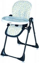 Krzesełko do karmienia, które dostosowuje się do potrzeb rosnącego dziecka. Posiada 6-stopniowa regulację wysokości (od 64 do 84 cm), 3-stopniowa regulację pochylenia oparcia oraz 3-stopniowa regulację blatu. Hamuec na tylnych kółkach zapobiega przesuwaniu krzesełka przez dziecko. Krzesełko można złożyć do niewielkich rozmiarów.