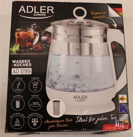 SALE OUT. Adler AD 1299 Kettle with Temperature Control and Tea Infuser, Electric, Power 2200W, Capacity 1.5 L, White | Adler | Kettle | AD 1299 | Electric | 2200 W | 1.5 L | Glass/Stainless steel | 360 rotational base | White | DAMAGED PACKAGING one size