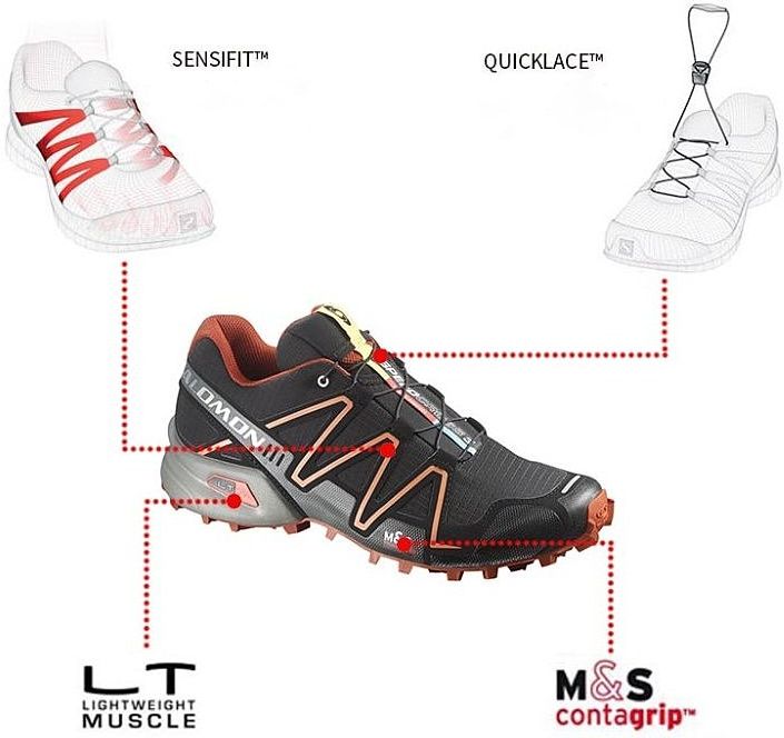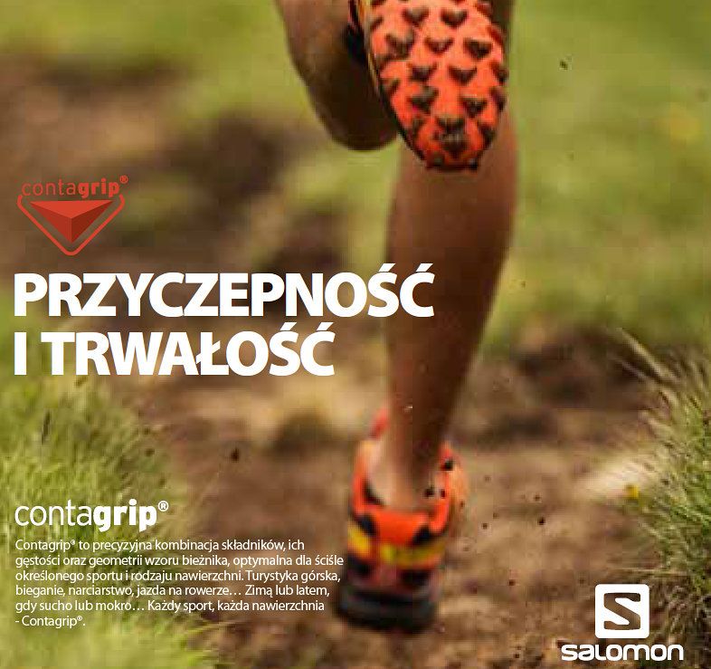 W bucie zastosowano genialne podeszwy Salomona o nazwie CONTAGRIP TA z systemem Salomon Light Weight Muscle charakteryzujące się niezwykłą lekkością, dające nadzwyczajną przyczepność na śliskim podłożu oraz doskonale amortyzujące i tłumiące wstrząsy,oddające energię przy wybiciu. Dzięki specjalnej rzeźbie bieżnika uzyskano doskonały efekt samooczyszczania się podeszew z piasku, błota czy gliny.