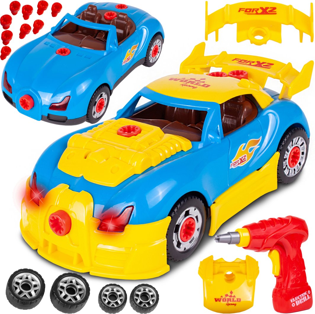 Rozkręcany samochód to idealna zabawka dla małych majsterkowiczów. W skład zestawu wchodzi mnóstwo części, m.in. koła, spojler, dodatkowe nakładki, śruby.