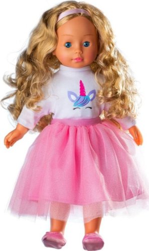 Emma ma długie, szczotkowane blond włosy, które można stylizować na różne sposoby. Dzieci mogą bawić się w fryzjera, tworząc różnorodne uczesania, co rozwija ich kreatywność i zdolności manualne. Stylowa różowa spódnica oraz biała koszula z fioletowym nadrukiem jednorożca dodają jej uroku, a różowe buciki i piękna opaska na głowie dopełniają całości.