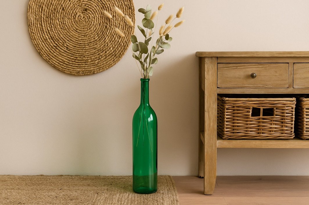 Butelkowy kształt o wysokości 75 cm i subtelny połysk szkła sprawiają, że ten dekoracyjny element przyciąga wzrok w każdym pomieszczeniu – od salonu, przez jadalnię, aż po przestrzeń eventową.