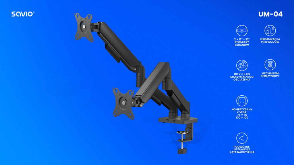 Podwójny uchwyt na sprężynie UM-04 jest przeznaczony do dwóch ekranów o przekątnej od 17 do 32 cali i maksymalnej wadze 9 kg na każdy monitor. Umożliwia wygodne korzystanie z dwóch wyświetlaczy jednocześnie – niezależnie od tego, czy pracujesz, projektujesz czy grasz.