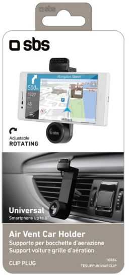 Prosta konstrukcja uchwytu samochodowego SBS pozwoli Ci korzystać ze smartfona jako nawigatora. Kompatybilny ze smartfonami od 3 do 6 cali. Można go nakładać na kratki wentylacyjne. Jest w stanie wykonać obrót o 360 °, aby utrzymać smartfon w najwygodniejszej pozycji, poziomo i pionowo. Szybka i łatwa instalacja dzięki klipsowi, który łatwo mieści się w kratce wentylacyjnej.