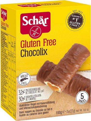 Dieta bezglutenowa polega na bezwzględnej eliminacji z pożywienia produktów zawierających w składzie gluten. Gluten z natury występuje w: pszenicy, życie, jęczmieniu, owsie, orkiszu i pszenżycie. Dopuszczalna ilość glutenu w produkcie poniżej 20 ppm = 0,02%, co muszą potwierdzić badania w akredytowanym laboratorium. Firma Schar jest numerem 1 w Europie w produkcji bezglutenowej mąki, chleba, makaronów, przekąsek, ciastek i słodyczy. Chocolix Schär to batonik na bazie herbatnika w miękkim karamelu i delikatnej czekoladzie. Opakowanie zawiera 5 sztuk. Jest idealnym snackiem bezglutenowym w podróży.