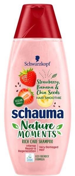 Szampon Nature Moments Hair Smoothie - Truskawka, Banan i Nasiona Chia. Zawiera esencje w 100% pochodzenia naturalnego. Intensywnie naprawia i regeneruje bardzo zniszczone włosy. Ekologiczna formuła bez parabenów i silikonów.
