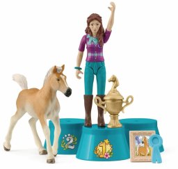 W zestawie znajdują się starannie wykonane figurki Lisy oraz jej uśmiechniętego źrebaka. Lisa, dumnie trzymając złoty puchar, radośnie macha do publiczności, a obok niej stoi jej mały przyjaciel, który również otrzymuje niebieską kokardę. Te urocze postacie zachęcają do kreatywnej zabawy i odgrywania ról.