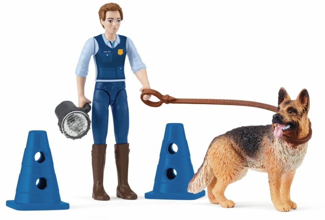 W skład zestawu wchodzi figurka policjanta z latarką oraz jego wierny owczarek niemiecki. Te elementy zachęcają do kreatywnej zabawy, umożliwiając dzieciom tworzenie własnych, ekscytujących historii.