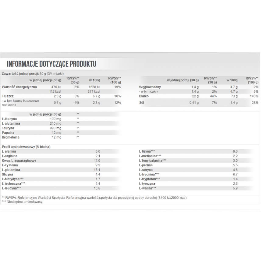 Składniki: Czekoladowo-masło orzechowe: Koncentrat białek serwatki (wyprodukowany z mleka, emulgator: lecytyna sojowa) zawierający frakcje mleka; laktoglobulinę, laktoferrynę, laktoalbuminę oraz immunoglobuliny, Tauryna, proszek kakao o obniżonej zawartości tłuszczu (10-12%), aromat (czekoladowy, masło orzechowe), Dekstroza, Chlorek sodu, L-Glutamina, substancja zagęszczająca (Guma ksantanowa), substancje słodzące (Acesulfam K, Sukraloza), L-Leucyna, Izolat białek serwatki (wyprodukowany z mleka, emulgator: lecytyna sojowa), Bromelaina pozyskana z Ananas comosus (1200 GDU/g), Papaina pozyskana z Carica papaya (1,5 FIP U/mg).