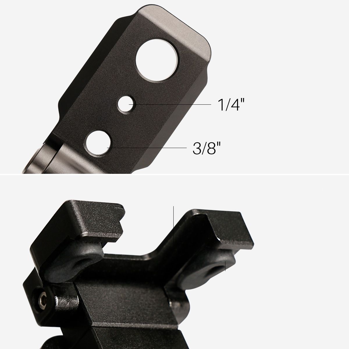Uchwyt posiada 2x zimną stopkę typu ISO – jest to jeden z najpopularniejszych sposobów montażu akcesoriów video / foto.