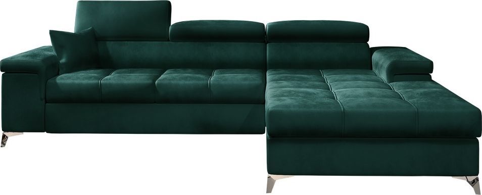 Narożnik prezentuje się naprawdę pięknie i świetnie sprawdzi się w każdym salonie, dodając pomieszczeniu niesamowitego wdzięku. Mebel posiada funkcję spania, dzięki czemu jest niezwykle praktyczny podczas wizyty gości. W otomanie znajduje się pojemnik, w którym wygodnie przechowasz dodatkową pościel czy inne tekstylia. Regulowane zagłówki oraz wygodne podłokietniki zadbają o komfortowy wypoczynek, a urocze pikowanie nadaje kompozycji pięknego wykończenia. Całość opiera się na chromowanych nóżkach, które zapewniają konstrukcji stabilne podparcie. Mebel obito gładką i niezwykle przyjemną w dotyku tkaniną welurową w kolorze butelkowej zieleni, która przyciągnie wzrok każdego gościa.