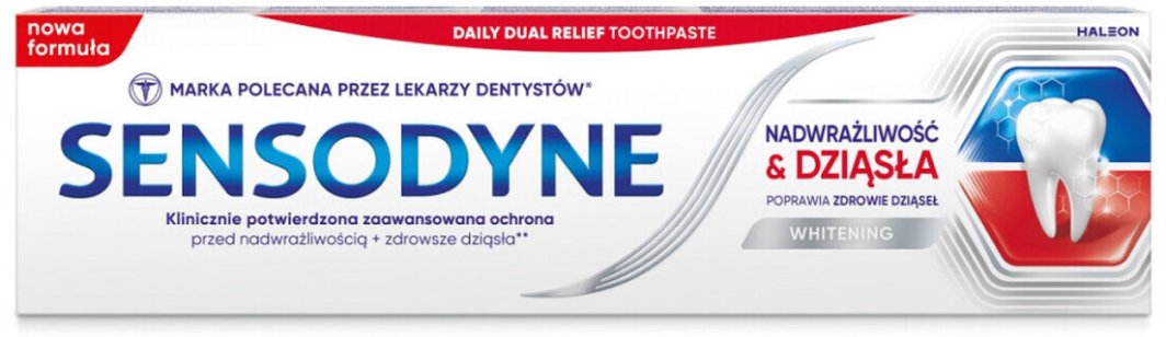 Pasta do zębów Sensodyne Nadwrażliwość i Dziąsła to nowoczesny produkt stworzony z myślą o osobach z wrażliwymi zębami oraz problemami z dziąsłami. Dzięki klinicznie potwierdzonej formule, skutecznie łagodzi objawy nadwrażliwości, tworząc ochronną warstwę na wrażliwych obszarach zębów. Regularne stosowanie pasty przyczynia się do poprawy ogólnej higieny jamy ustnej, wspierając zdrowie dziąseł i eliminując bakterie z płytki nazębnej.