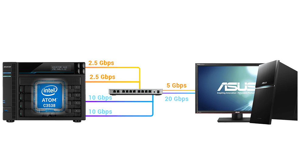 Zupełnie nowa seria Lockerstor NAS jest wyposażona w dwa porty Intel 10-Gigabit Ethernet, a także dwa porty Realtek 2,5-Gigabit Ethernet. Dzięki zarządzanemu przełącznikowi, który obsługuje wiele prędkości, możesz skorzystać z prędkości do 20 Gb / s w przypadku obu portów 10-Gigabit lub do 5 Gb / s na obu portach 2,5-Gigabit.