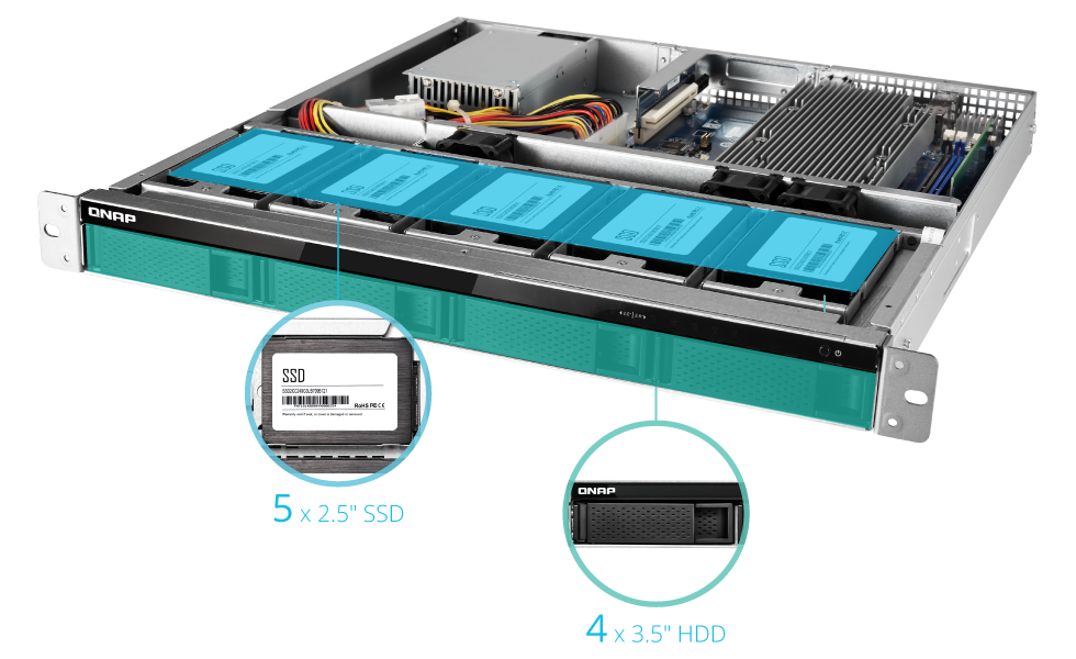 Model TS-977XU-RP ma hybrydową konstrukcję HDD+ SSD (wyposażony w pięć 2,5-calowych i cztery 3,5-calowe wnęki na dyski*), pozwalając na korzystanie zarówno z dysków twardych, jak i dysków SSD w celu zapewnienia dużej pojemności pamięci masowej i wysokiej wydajności. Technologia Qtier™ umożliwia korzystanie w serwerze TS-977XU-RP z automatycznego pozycjonowania danych, które nieustannie optymalizuje wykorzystanie pamięci masowej na dyskach SSD i dyskach twardych o dużej pojemności. Nowa technologia Qtier™ 2.0 zapewnia monitoring operacji wejścia/wyjścia, która wzbogaca pozycjonowaną pamięć masową SSD o podobną do pamięci podręcznej zastrzeżoną przestrzeń w celu obsługi zwiększonej liczby operacji wejścia/wyjścia w czasie rzeczywistym, maksymalnie zwiększając korzyści dysku SSD.